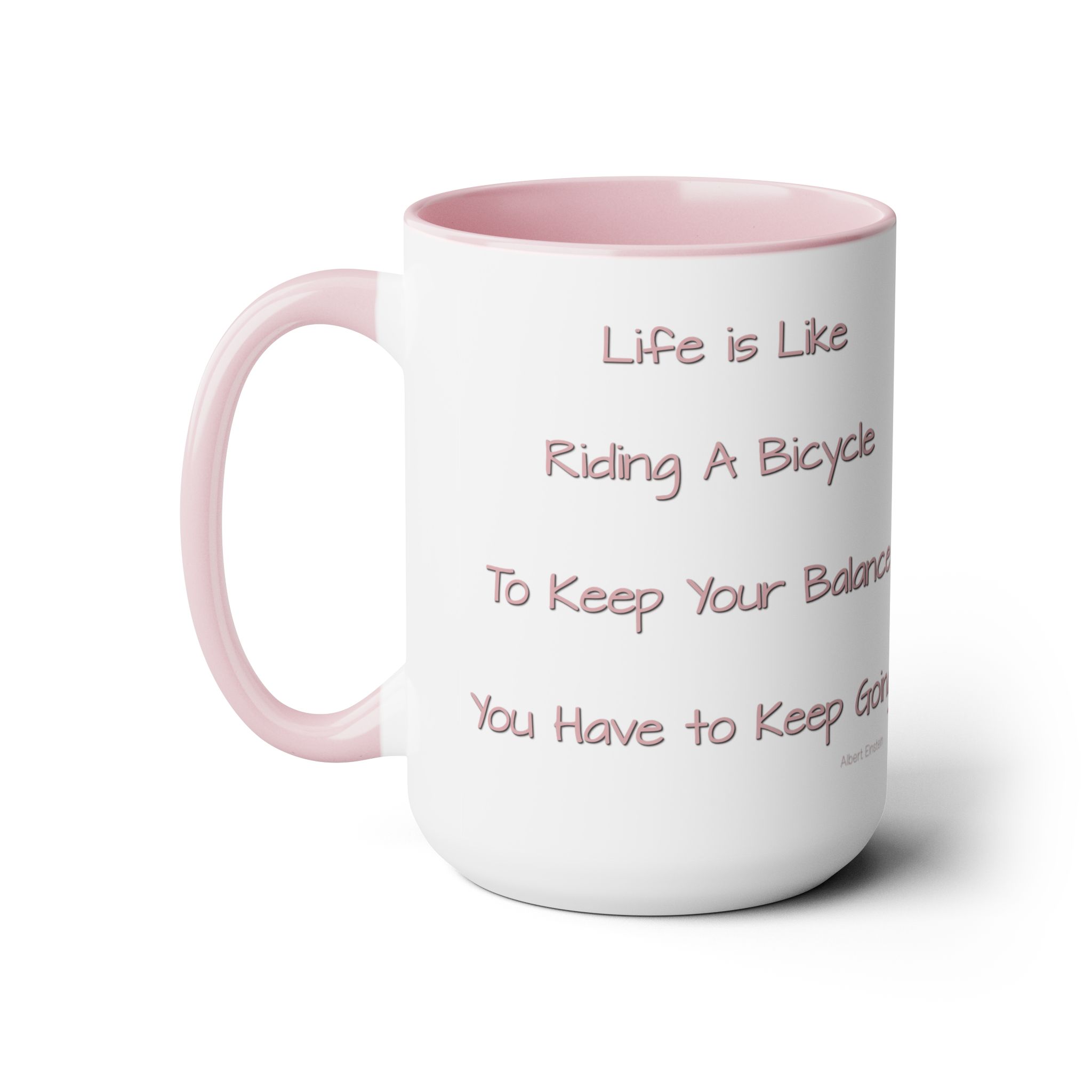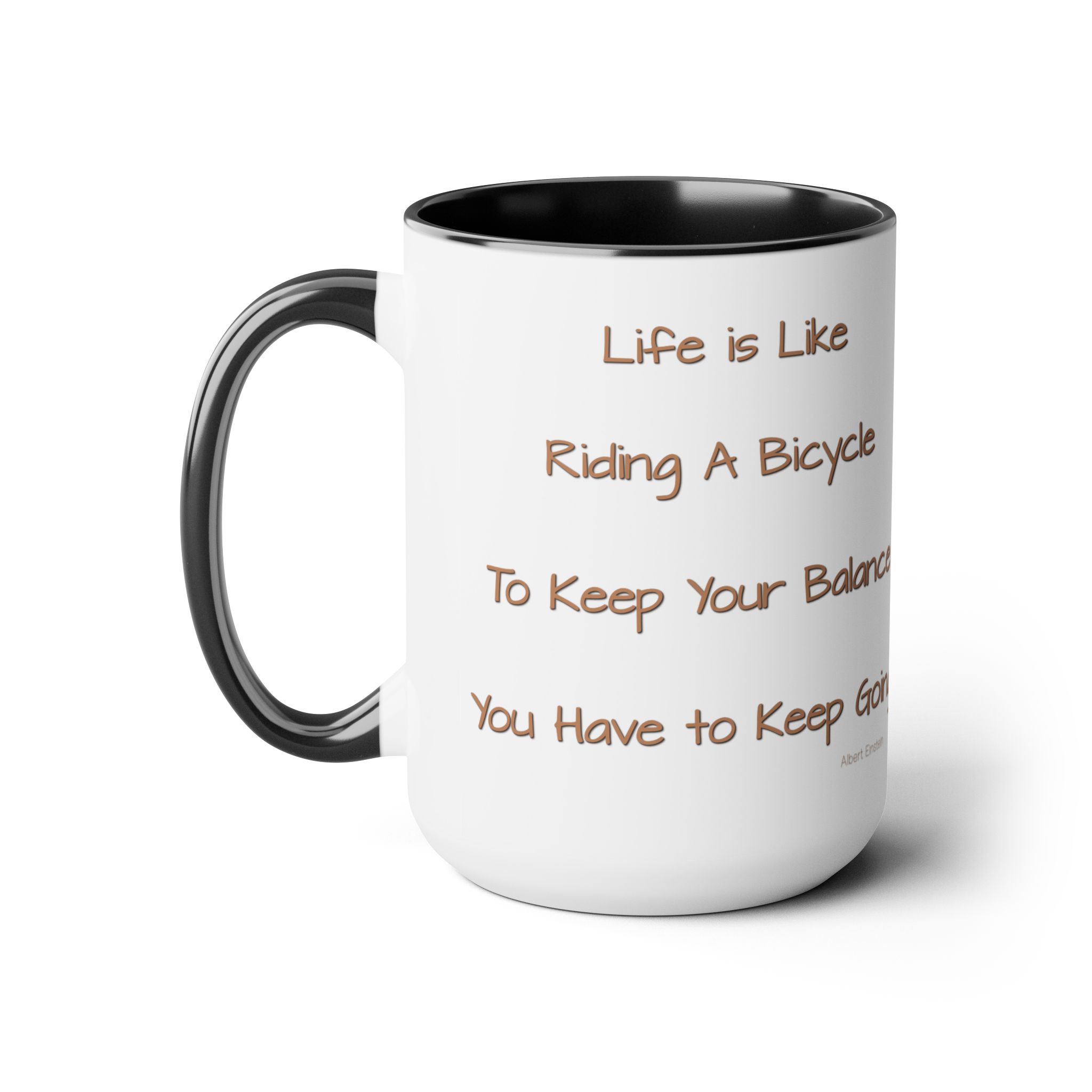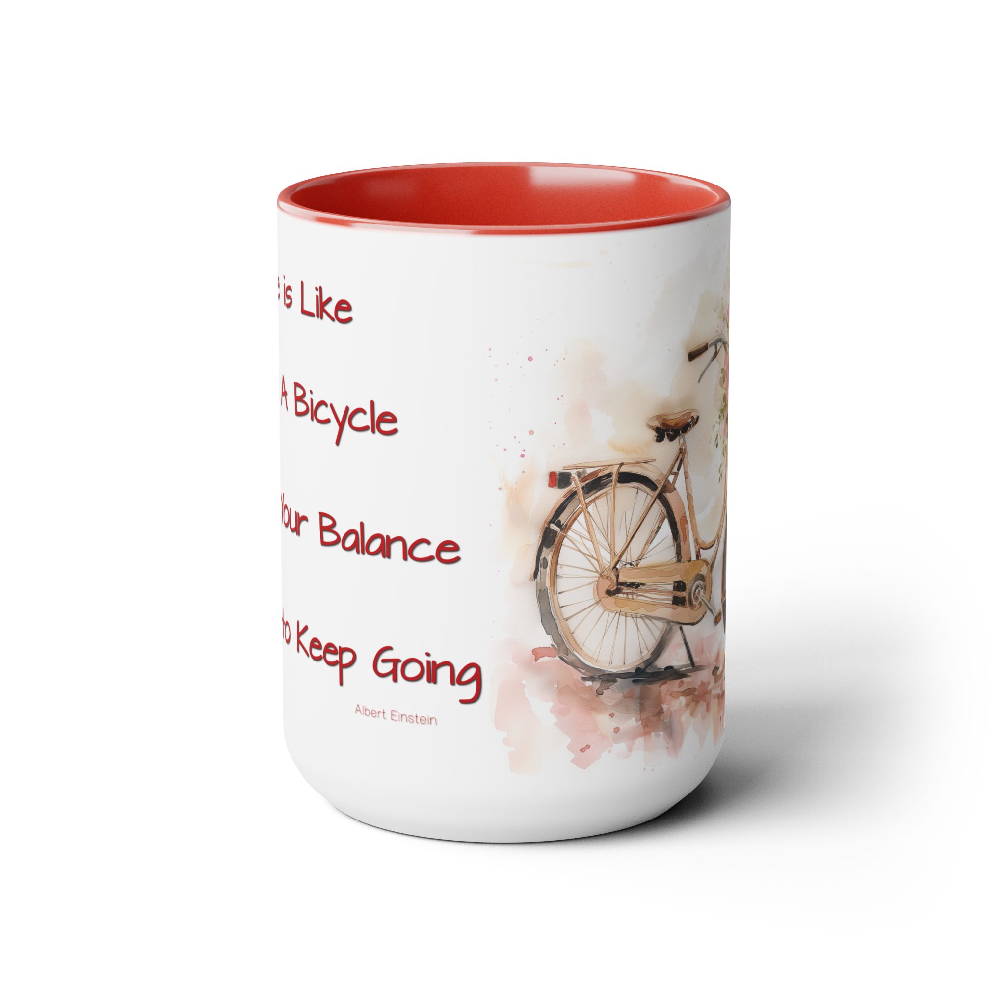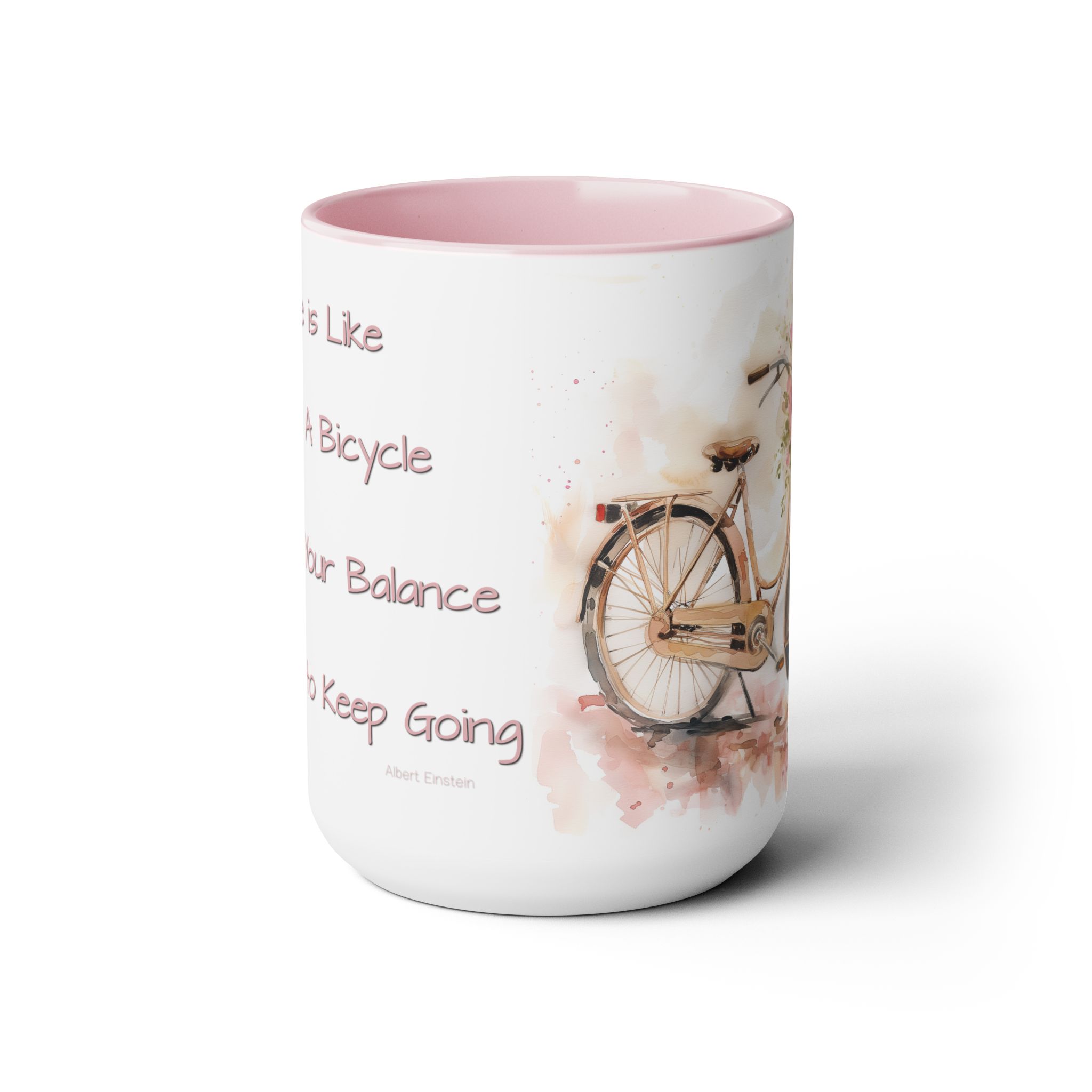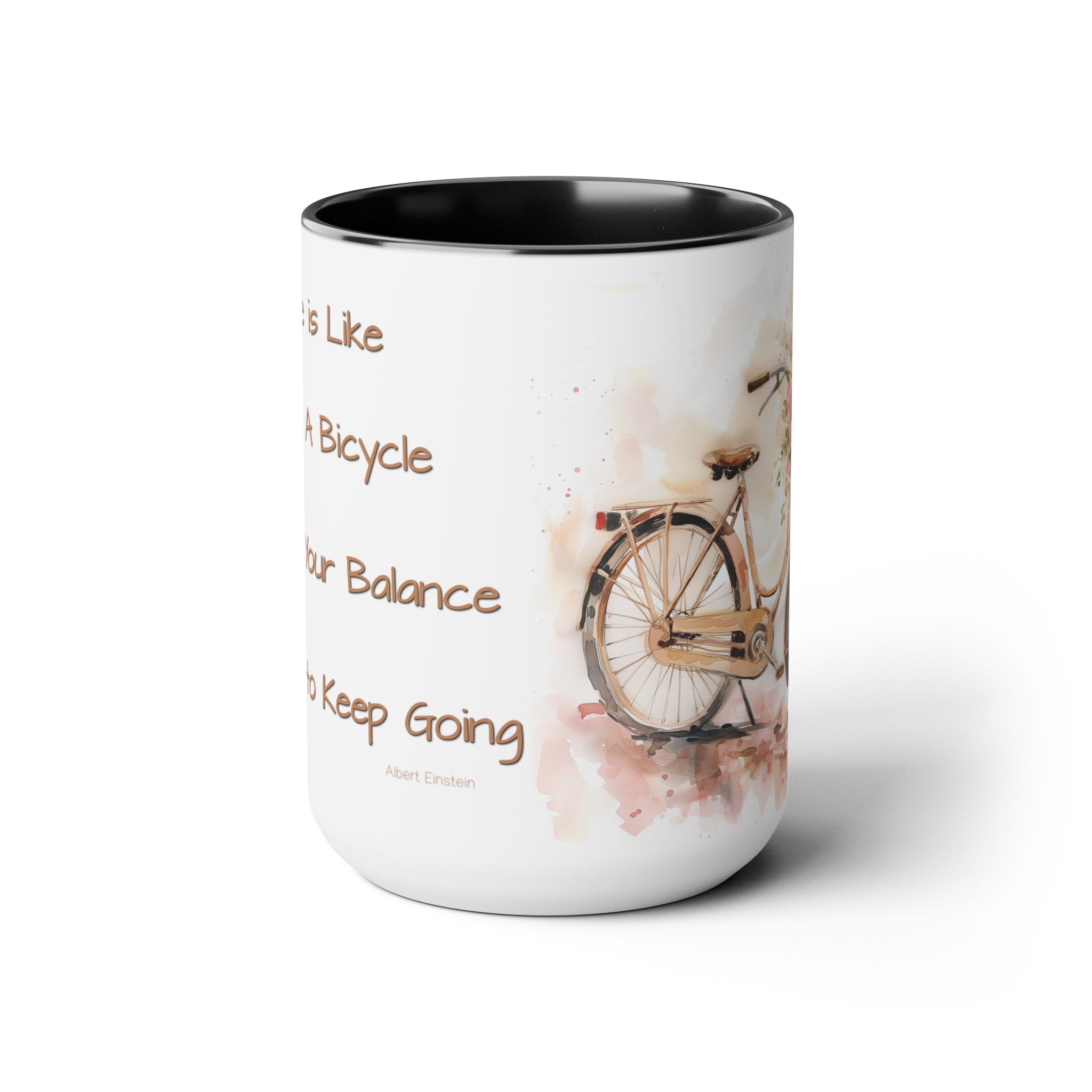 Experience a touch of inspiration with our latest 15oz ceramic mug featuring a charming watercolor bicycle on the front and a profound quote by Albert Einstein on the back: “Life is like riding a bicycle. To keep your balance, you have to keep going.”