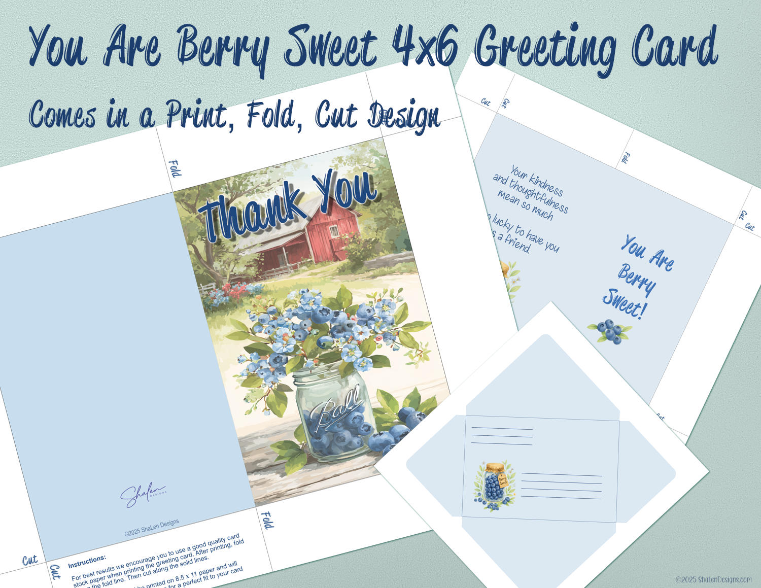 Blueberry Thank You Card Printable – “You Are Berry Sweet” 4×6 Greeting Card with Matching Envelope